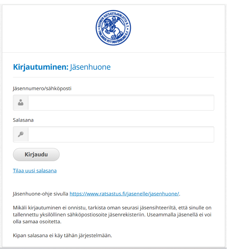 Jäsenhuoneeseen kirjautumista varten jäsenellä täytyy olla yksilöllinen sähköpostiosoite (=ei samaa osoitetta rekisterissä useammalla henkilöllä), jonka lisäksi tarvitset jäsennumerosi. Se löytyy Hippos-lehden osoitekentästä (SRL-täysjäsenet) tai kysymällä seuran jäsensihteeriltä. Mikäli sähköpostiosoitteesi tarvitsee päivitystä tai kirjautuminen ei onnistu, olethan yhteydessä niin ikään seuramme jäsensihteeriin.