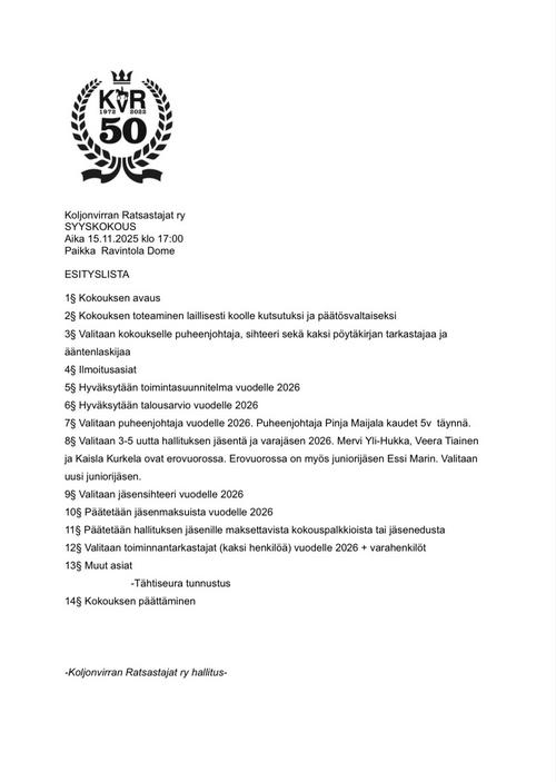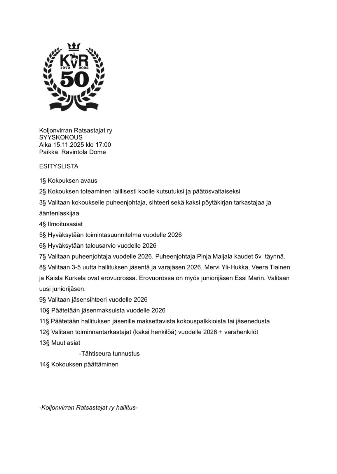 Ilmoittautumiset Forms-lomakkeella pe 7.11. mennessä. Syyskokoukseen on mahdollisuus osallistua myös etäyhteydellä, ilmoittauduthan lomakkeella myös mikäli haluat etäyhteydellä mukaan.